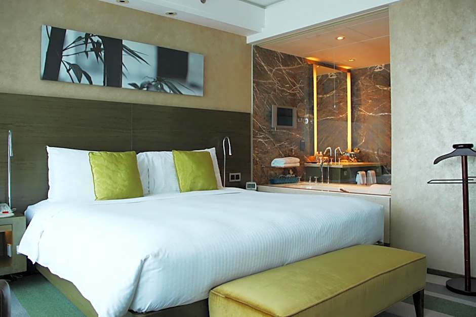 Spacious corner rooms on floors 25-37 overlook The Bund and come with 2 flat-screen TVs.